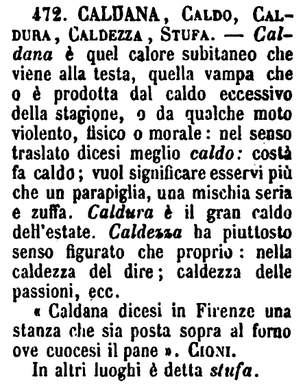 Caldana, Caldo, Caldura, Caldezza, Stufa - Caldana è quel calore subitaneo che viene alla testa, quella vampa che o è prodotta dal caldo eccessivo della stagione, o da qualche moto violento, fisico o morale: nel senso traslato dicesi meglio caldo: costà fa caldo; vuol significare esservi più che un parapiglia, una mischia seria e zuffa. Caldura è il gran caldo dell'estate. Caldezza ha piuttosto senso figurato che proprio: nella caldezza del dire; caldezza delle passioni, ecc.