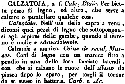 Calzatoia. Nell'uso della capra a venti, diconsi quei pezzi di legno che sottopongonsi agli arpioni delle gambe, quando il terreno è molle e sdrucciolevole. Calzatoie a manico. Coins de recul, Masses. Conî di legno con un manico fitto a pendio in una delle loro facciate laterali, con che si calzano le ruote dell'affusto da piazza dopo lo sparo, per torgli il tornar da se stesso in batteria. Carb. e Ar. [immagine] |