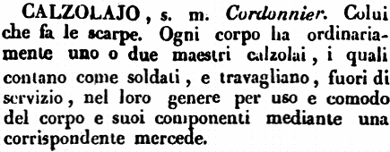 Calzolajo - s. m. Cordonnier. Colui che fa le scarpe. Ogni corpo ha ordinariamente uno o due maestri calzolai, i quali contano come soldati, e travagliano, fuori di servizio, nel loro genere per uso e comodo del corpo e suoi componenti mediante una corrispondente mercede. [immagine]