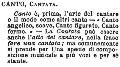 | Canto, Cantata - Canto è, prima, l'arte del cantare o il modo come altri canta - « Canto angelico, soave, Canto figurato, Canto fermo. » - La Cantata può essere anche l'atto del cantare, nella frase fare una cantata; ma comunemente si prende per Una specie di composizione musicale a più voci e per sè stante. [immagine] |