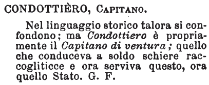 | Condottiero, Capitano - Nel linguaggio storico talora si confondono; ma Condottiero è propriamente il Capitano di ventura; quello che conduceva a soldo schiere raccogliticce e ora serviva questo, ora quello Stato. G. F. [immagine] |