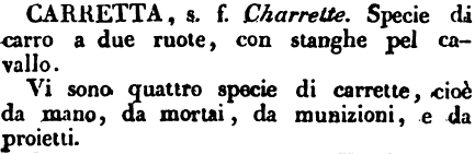 | Carretta - s. f. Charrette. Specie di carro a due ruote, con stanghe pel cavallo.