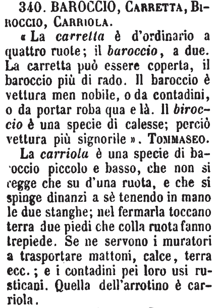 | Baroccio, Carretta, Biroccio, Carriola - «La carretta è d'ordinario a quattro ruote; il baroccio, a due. La carretta può essere coperta, il baroccio più di rado. Il baroccio è vettura men nobile, o da contadini, o da portar roba qua e là. Il biroccio è una specie di calesse; perciò vettura più signorile». Tommaseo.
