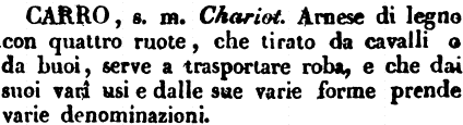 | Carro - s. m. Chariot. Arnese di legno con quattro ruote, che tirato da cavalli o da buoi, serve a trasportare roba, e che dai suoi vari usi e dalle sue varie forme prende varie denominazioni. [immagine] |