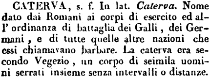 «Caterva, moltitudine non piccola, armata o no, e non molto ordinata. Latinismo omai rado; ma pur diciamo, in senso quasi di spregio: una caterva di cortigiani, di dottori, di gente». Romani. [immagine]