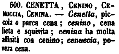 | Cenetta, Cenino, Cenuccia, Cenina - Cenetta, piccola o parca cena; cenino, cena lieta e squisita; cenina ha molta affinità con cenino; cenuccia, povera cena. [immagine] |
