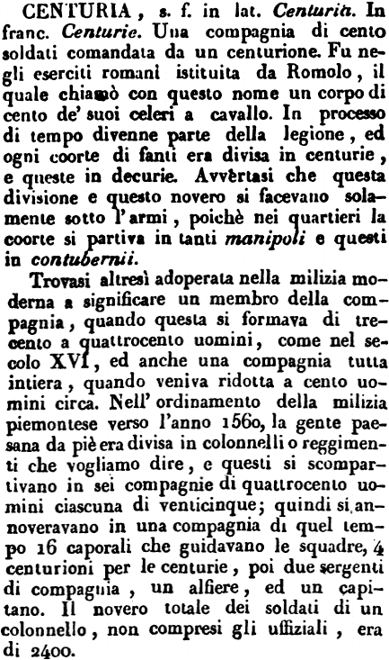 Trovasi altresì adoperata nella milizia moderna a significare un membro della compagnia, quando questa di formava di trecento a quattrocento uomini, come nel secolo XVI, ed anche una compagnia tutta intiera, quando veniva ridotta a cento uomini circa. Nell'ordinamento della milizia piemontese verso l'anno 1560, la gente paesana da piè era divisa in colonnelli o reggimenti che vogliamo dire, e questi si scompartivano in sei compagnie di quattrocento uomini ciascuna di venticinque; quindi si annoveravano in una compagnia di quel tempo 16 caporali che guidavano le squadre, 4 centurioni per le centurie, poi due sergenti di compagnia, un alfiere, ed un capitano. Il novero totale dei soldati di un colonnello, non compresi gli uffiziali, era di 2400. [immagine] |