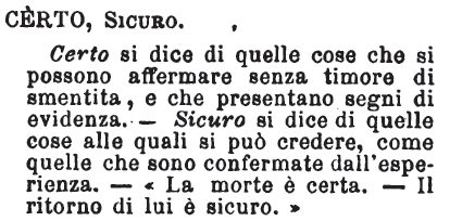 | Certo, Sicuro - Certo si dice di quelle cose che si possono affermare senza timore di smentita, e che presentano segni di evidenza. - Sicuro si dice di quelle cose alle quali si può credere, come quelle che sono confermate dall'esperienza. - «La morte è certa. - Il ritorno di lui è sicuro.» [immagine] |