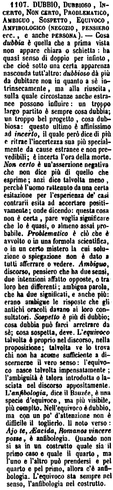 | Dubbio, Dubbioso, Incerto, Non certo, Problematico, Ambiguo, Sospetto, Equivoco, Amfibologico (negozio, pensiero ecc., e anche persona) - Cosa dubbia è quella che a prima vista non appare chiara o schietta: ha quasi senso di doppio per infinto, che cioè sotto una certa apparenza nasconda tutt'altro: dubbioso dà più da dubitare non in quanto a sè intrinsecamente, ma alla riuscita, sulla quale circostanze anche estranee possono influire: un troppo largo partito è sempre cosa dubbia; un troppo bel progetto, cosa dubbiosa: questo ultimo è affinissimo ad incerto, il quale però dice di più e ritrae l'incertezza sua più specialmente da cause estranee e non prevedibili; è incerta l'ora della morte. Non certo è un'asserzione negativa che non dice più di quello che esprime; anzi dice talvolta meno, perchè l'uomo rattenuto da una certa esitazione per l'esperienza de' casi contrarii esita ad accertare positivamente; onde dicendo: questa cosa non è certa, pare voglia significare che lo è quasi, o almeno assai probabile. Problematico è ciò che è avvolto o in una formola scientifica, o in un certo mistero la cui soluzione o spiegazione non è dato a tutti afferrare o vedere. Ambiguo, discorso, pensiero che ha due sensi, due intenzioni affatto opposte, o tra loro ben differenti; ambigua parola, che ha due significati, e anche più: erano ambigue le risposte che gli antichi oracoli davano ai loro consultatori. Sospetto è più di dubbio; cosa dubbia può farci arretrare da sè; cosa sospetta, deve. L'equivoco talvolta è proprio nel discorso, nella proposizione; talvolta ve lo trova chi non ha acume sufficiente a discernerne il vero senso: l'equivoco nasce talvolta impensatamente; l'ambiguità è talora introdotta o lasciata nel discorso appositamente. L'anfibologia, dice il Bauzée, è una specie d'equivoco, ma più visibile, più compito. Nell'equivoco è dubbio, ma con un po' d'attenzione non è difficile il toglierlo. Il noto verso: Ajo te, Æacida, Romanos vincere posse, è anfibologia. Quando non si sa in un costrutto quale sia il primo caso e quale il quarto, ma l'uno e l'altro può prendersi e pel quarto e pel primo, allora c'è anfibologia. L'equivoco sta sempre nel senso, l'anfibologia nel costrutto. [immagine] |