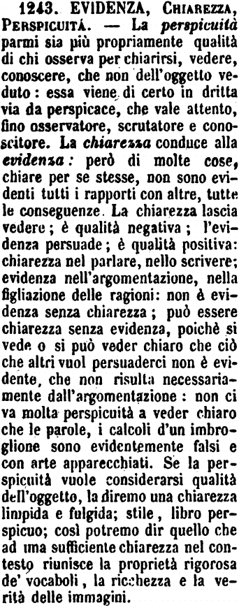 | Evidenza, Chiarezza, Perspicuità - La Perspicuità parmi sia più propriamente qualità di chi osserva per chiarirsi, vedere, conoscere, che non dell'oggetto veduto: essa viene di certo in diritta via da perspicace, che vale attento, fino osservatore, scrutatore e conoscitore che sa guardare e vedere quasi attraverso. - La Chiarezza conduce alla Evidenza: però di molte cose, chiare per sè stesse, non sono evidenti tutti i rapporti con altre, tutte le conseguenze. La chiarezza lascia vedere; è qualità negativa; l'evidenza persuade, è qualità positiva: chiarezza nel parlare, nello scrivere; evidenza nell'argomentazione, nella precedenza delle ragioni: non è evidenza senza chiarezza; può essere chiarezza senza evidenza, poichè si vede o si può veder chiaro che ciò che altri vuol persuaderci non è evidente, che non risulta necessariamente dall'argomentazione: non ci va molta perspicuità a veder chiaro che le parole, i calcoli di un imbroglione sono evidentemente falsi e con arte apparecchiati. Se la perspicuità vuole considerarsi qualità dell'oggetto, la diremo una chiarezza limpida e fulgida; stile, libro perspicuo; così potremmo dir quello che ad una sufficiente chiarezza nel contesto riunisce la proprietà rigorosa de' vocaboli, la ricchezza e la verità delle immagini. [immagine] |