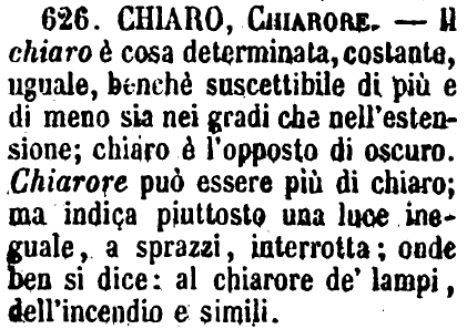 | Chiaro, Chiarore - Il chiaro è cosa determinata, costante, uguale, benchè suscettibile di più e di meno sia nei gradi che nell'estensione; chiaro è l'opposto di oscuro. Chiarore può essere più di chiaro; ma indica piuttosto una luce ineguale, a sprazzi, interrotta; onde ben si dice: al chiarore de' lampi, dell'incendio e simili. [immagine] |