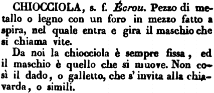 | Chiocciola - s. f. Ècrou. Pezzo di metallo o legno con un foro in mezzo fatto a spira, nel quale entra e gira il maschio che si chiama vite.