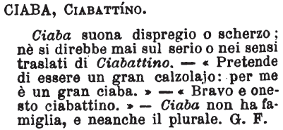 | Ciaba, Ciabattino - Ciaba suona dispregio o scherzo; nè si direbbe mai sul serio o nei sensi traslati di Ciabattino. - «Pretende di essere un gran calzolajo: per me è un gran ciaba.» - «Bravo e onesto ciabattino.» - Ciaba non ha famiglia, e neanche il plurale. G. F. [immagine] |