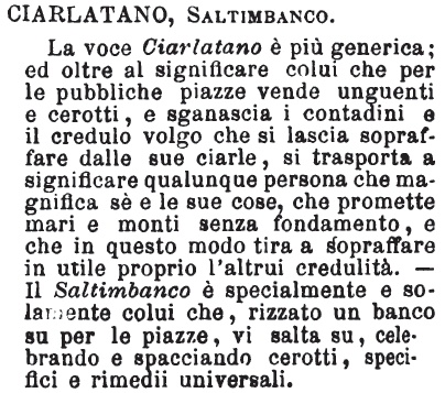 | Ciarlatano, Saltimbanco - La voce Ciarlatano è più generica; ed oltre al significare colui che per le pubbliche piazze vende unguenti e cerotti, e sganascia i contadini e il credulo volgo che si lascia sopraffare dalle sue ciarle, si trasporta a significare qualunque persona che magnifica sè e le sue cose, che promette mari e monti senza fondamento, e che in questo modo tira a sopraffare in utile proprio l'altrui credulità. - Il Saltimbanco è specialmente e solamente colui che, rizzato un banco su per le piazze, vi salta su, celebrando e spacciando cerotti, specifici e rimedii universali. [immagine] |