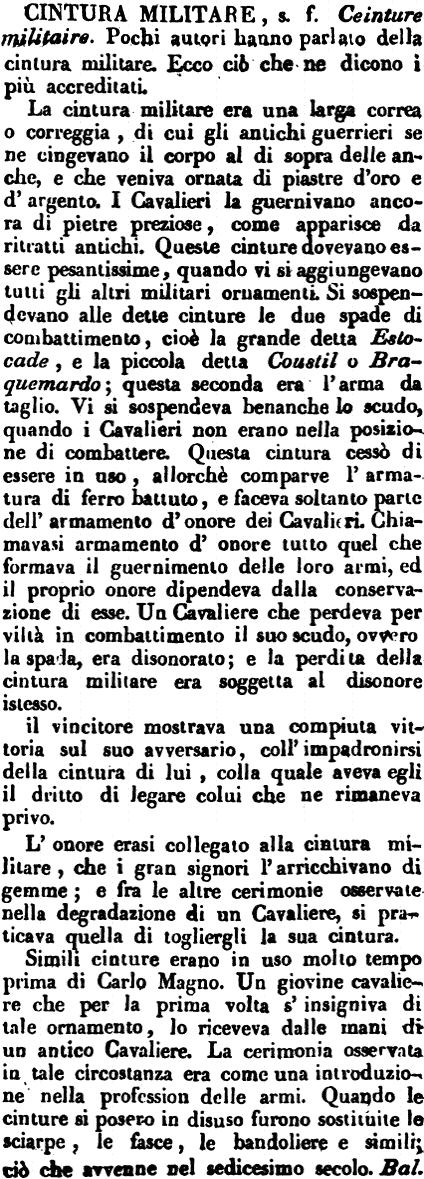 La cintura militare era una larga correa o correggia, di cui gli antichi guerrieri se ne cingevano il corpo al di sopra delle anche, e che veniva ornata di piastre d'oro e d'argento. I Cavalieri la guernivano ancora di pietre preziose, come apparisce da ritratti antichi. Queste cinture dovevano essere pesantissime, quando vi si aggiungevano tutti gli altri militari ornamenti. Si sospendevano alle dette cinture le due spade di combattimento, cioè la grande detta Estocade, e la piccola detta Coustil o Braquemardo; questa seconda era l'arma da taglio. Vi si sospendeva benanche lo scudo, quando i Cavalieri non erano nella posizione di combattere. Questa cintura cessò di essere in uso, allorchè comparve l'armatura di ferro batturo, e faceva soltanto parte dell'armamento d'onore dei Cavalieri. Chiamavasi armamento d'onore tutto quel che formava il guernimento delle loro armi, ed il proprio onore dipendeva dalla conservazione di esse. Un Cavaliere che perdeva per viltà in combattimento il suo scudo, ovvero la spada, era disonorato; e la perdita della cintura militare era soggetta al disonore istesso. Il vincitore mostrava una compiuta vittoria sul suo avversario, coll'impadronirsi della cintura di lui, colla quale aveva egli il dritto di legare colui che ne rimaneva privo. L'onore erasi collegato alla cintura militare, che i gran signori l'arricchivano di gemme; e fra le altre cerimonie osservate nella degradazione di un Cavaliere, si praticava quella di togliergli la sua cintura. Simili cinture erano in uso molto tempo prima di Carlo Magno. Un giovine cavaliere che per la prima volta s'insigniva di tale ornamento, lo riceveva dalle mani di un antico Cavaliere. La cerimonia osservata in tale circostanza era come una introduzione nella profession delle armi. Quando le cinture si posero in disuso furono sostituite le sciarpe, le fasce, le bandoliere e simili; ciò che avvenne nel sedicesimo secolo. Bal. [immagine] |