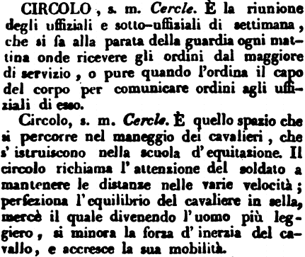 | Circolo - s. m. Cercle. È la riunione degli uffiziali e sotto-uffiziali di settimana, che si fa alla parata della guardia ogni mattina onde ricevere gli ordini dal maggiore di servizio, o pure quando l'ordina il capo del corpo per comunicare ordini agli uffiziali di esso.