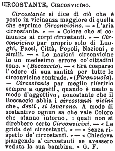 | Circostante, Circonvicino - Circostante si dice di ciò che è posto in vicinanza maggiore di quella che esprime Circonvicino. - «L'aria circostante.» - «Colore che si comunica ai corpi circostanti.» - Circonvicino par proprio solo di Luoghi, Paesi, Città, Popoli, Nazioni, e simili. - «Le nazioni circonvicine in un medesimo errore co' cittadini sono.» (Boccaccio). - «Era cosparso l'odore di sua santità per tutte le circonvicine contrade.» (Firenzuola). - Circostante par meglio riferirlo sempre a oggetti, quando è usato a modo d'aggettivo, nonostante che il Boccaccio abbia i circostanti vicini che, desti, si levarono. A modo di sostantivo ognun sa che vale Coloro che stanno intorno, i quali non si direbbero certo Circonvicini. - «Le grida dei circostanti.» - «Senza rispetto de' circostanti.» - «Chiedeva piangendo a' circostanti se avessero veduta la sua bambina.» G.F. [immagine] |