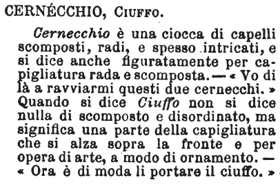 | Cernecchio, Ciuffo - Cernecchio è una ciocca di capelli scomposti, radi, e spesso intricati, e si dice anche figuratamente per capigliatura rada e scomposta. - «Vo di là a ravviarmi questi due cernecchi.» Quando si dice Ciuffo non si dice nulla di scomposto e disordinato, ma significa una parte della capigliatura che si alza sopra la fronte e per opera di arte, a modo di ornamento. - «Ora è di moda li portare il ciuffo.» [immagine] |