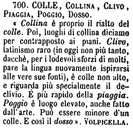 | Colle, Collina, Clivo, Piaggia, Poggio, Dosso - «Collina è proprio il rialto del colle. Poi, luoghi di collina diciamo per contrapposto ai piani. Clivo, latinismo raro (in oggi non più tanto, dacché, per i lodevoli sforzi di molti, pare la lingua nuovamente ispirarsi alle vere sue fonti), è colle non alto, e riguarda più specialmente il declivio. È più rapido della piaggia. Poggio è luogo elevato, anche fatto dall'arte. Può essere minore d'un colle. E così il dosso». Volpicella. [immagine] |