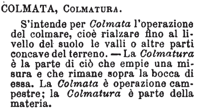 Colmata, Colmatura, Colmo - «Colmata è l’operazione del colmare le valli o altre parti concave del terreno». Tommaseo.