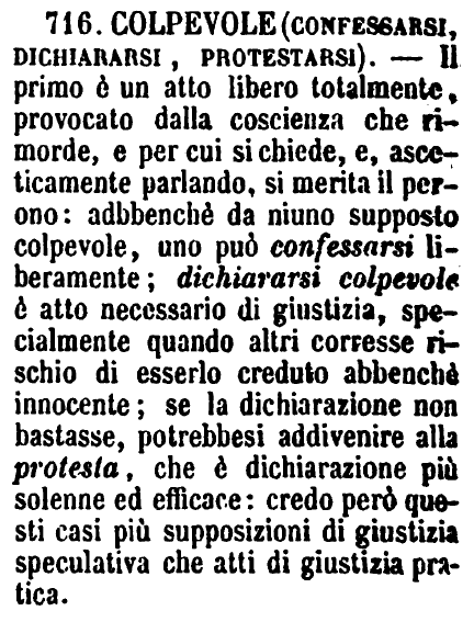 | Colpevole (confessarsi, dichiararsi, protestarsi) - Il primo è un atto libero totalmente, provocato dalla coscienza che rimorde, e per cui si chiede, e, asceticamente parlando, si merita il perdono: adbbenchè da niuno supposto colpevole, uno può confessarsi liberamente; dichiararsi colpevole è atto necessario di giustizia, specialmente quando altri corresse rischio di esserlo creduto abbenchè innocente; se la dichiarazione non bastasse, potrebbesi addivenire alla protesta, che è dichiarazione più solenne ed efficace: credo però questi casi più supposizioni di giustizia speculativa che atti di giustizia pratica. [immagine] |