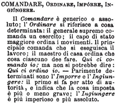 | Comandare, Ordinare, Imporre, Ingiungere - Il Comandare è generico e assoluto; l'Ordinare si riferisce a cosa determinata: il generale supremo comanda un esercito; il capo di stato maggiore ordina i movimenti. Il principale comanda che si eseguisca il lavoro; il maestro di casa ordina che cosa ciascuno dee fare. Qui ci comando io; ma non si potrebbe dire: Qui ci ordino io. - Parimente determinati sono l'Imporre e l'Ingiungere: il primo si fa per atto di autorità, e indica che la cosa imposta è più o meno grave; l'Ingiungere è più imperioso e più assoluto. [immagine] |