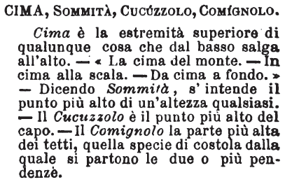 | Cima, Sommità, Cucuzzolo, Comignolo - Cima è la estremità superiore di qualunque cosa che dal basso salga all'alto. - « La cima del monte. - In cima alla scala. - Da cima a fondo.» - Dicendo Sommità, s'intende il punto più alto di un'altezza qualsiasi. - Il Cucuzzolo è il punto più alto del capo. - Il Comignolo la parte più alta dei tetti, quella specie di costola dalla quale si partono le due o più pendenze. [immagine] |