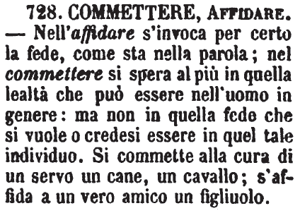 | Commettere, Affidare - Nell'affidare s'invoca per certo la fede, come sta nella parola; nel commettere si spera al più in quella lealtà che può essere nell'uomo in genere: ma non in quella fede che si vuole o credesi essere in quel tale individuo. Si commette alla cura di un servo un cane, un cavallo; s'affida a un vero amico un figliuolo. [immagine] |