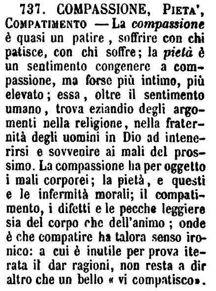 | Compassione, Compatimento - Questa non è la Compassione veduta qua dietro alla voce Commiserazione; ma quel sentimento quasi di dispregio, che proviamo per colui o che si millanta, o che presume cose sopra le sue forze, o che vitupera e insulta dissennatamente persone di gran valore. I così fatti si dicono essere più degni di compassione che di vendetta. - Il Compatimento è invece la indulgenza che si ha per gli altrui difetti; e quando altri non riesce nel suo assunto come dovrebbe, suol dire: «Se non ho fatto meglio, spero nel suo benigno compatimento.» [immagine] |