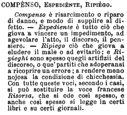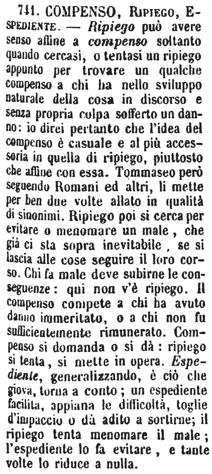 | Compenso, Ripiego, Espediente - Ripiego può avere senso affine a compenso soltanto quando cercasi, o tentasi un ripiego appunto per trovare un qualche compenso a chi ha nello sviluppo naturale della cosa in discorso e senza propria colpa sofferto un danno: io direi pertanto che l'idea del compenso è casuale e al più accessoria in quella di ripiego, piuttosto che affine con essa. Tommaseo però seguendo Romani ed altri, li mette per ben due volte allato in qualità di sinonimi. Ripiego poi si cerca per evitare o menomare un male, che già ci sta sopra inevitabile, se si lascia alle cose seguire il loro corso. Chi fa male deve subirne le conseguenze: qui non v'è ripiego. Il compenso compete a chi ha avuto danno immeritato, o a chi non fu sufficientemente rimunerato. Compenso si domanda o si dà: ripiego si tenta, si mette in opera. Espediente, generalizzando, è ciò che giova, torna a conto; un espediente facilita, appiana le difficoltà, toglie d'impaccio o dà adito a sortirne; il ripiego tenta menomare il male; l'espediente lo fa evitare, e tante volte lo riduce a nulla. [immagine] |