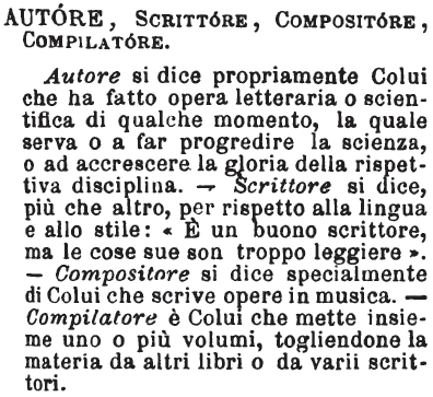 | Compositore, Scrittore - Compositore suole adoprarsi specialmente per colui che scrive opere in musica. - Scrittore invece è colui che compone opere letterarie; e si riferisce più specialmente alla forma e allo stile. - «il C. è tra' migliori scrittori d’Italia.» [immagine] |