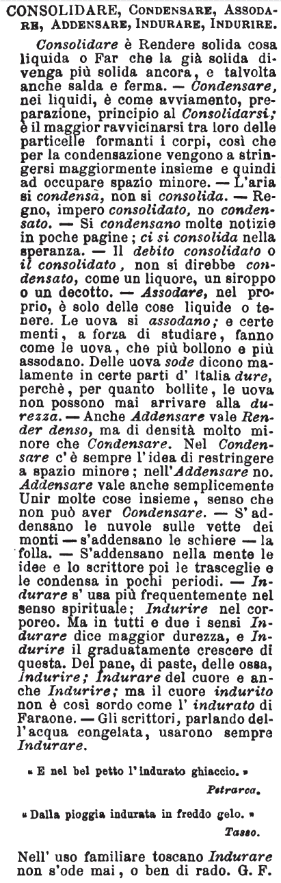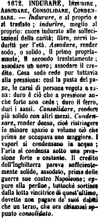 | Consolidare, Condensare, Assodare, Addensare, Indurare, Indurire - Consolidare è Rendere solida cosa liquida o Far che la già solida divenga più solida ancora, e talvolta anche salda e ferma. - Condensare, nei liquidi, è come avviamento, preparazione, principio al Consolidarsi; è il maggior ravvicinarsi tra loro delle particelle formanti i corpi, così che per la condensazione vengono a stringersi maggiormente insieme e quindi ad occupare spazio minore. – L’aria si condensa, non si consolida. – Regno, impero consolidato, no condensato. – Si condensano molte notizie in poche pagine; ci si consolida nella speranza. – Il debito consolidato o il consolidato, non si direbbe condensato, come un liquore, un siroppo o un decotto. - Assodare, nel proprio, è solo delle cose liquide o tenere. Le uova si assodano; e certe menti, a forza di studiare, fanno come le uova, che più bollono e più assodano. Delle uova sode dicono malamente in certe parti d’Italia dure, perché, per quanto bollite, le uova non possono mai arrivare alla durezza. – Anche Addensare vale Render denso, ma di densità molto minore che Condensare. Nel Condensare c’è sempre l’idea di restringere a spazio minore; nell’Addensare no. Addensare vale anche semplicemente Unir molte cose insieme, senso che non può aver Condensare. – S’addensano le nuvole sulle vette dei monti – s’addensano le schiere – la folla. – S’addensano nella mente le idee e lo scrittore poi le trasceglie e le condensa in pochi periodi. - Indurare s’usa più frequentemente nel senso spirituale; Indurire nel corporeo. Ma in tutti e due i sensi Indurare dice maggior durezza, e Indurire il graduatamente crescere di questa. Del pane, di paste, delle ossa, Indurire; Indurare del cuore e anche Indurire; ma il cuore indurito non è così sordo come l’indurato di Faraone. – Gli scrittori, parlando dell’acqua congelata, usarono sempre Indurare.