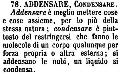 | Addensare, Condensare - Addensare è meglio mettere cose e cose assieme, per lo più della stessa natura; condensare è piuttosto del restringersi che fanno le molecole di un corpo qualunque per forza propria o altra esterna; si addensano le nubi, un liquido si condensa. [immagine] |
