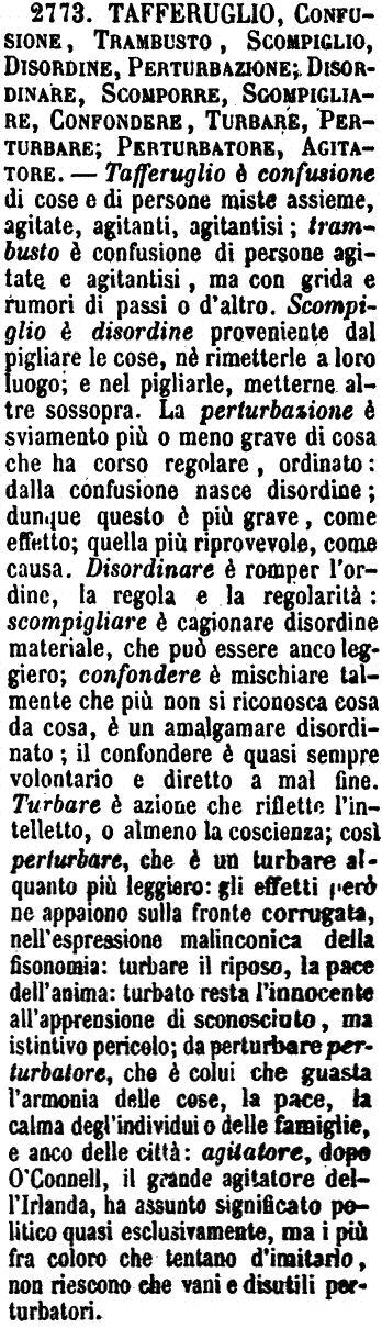 | Tafferuglio, Confusione, Trambusto, Scompiglio, Disordine, Perturbazione; Disordinare, Scomporre, Scompigliare, Confondere, Turbare, Perturbare; Perturbatore, Agitatore - Tafferuglio è confusione di cose e di persone miste assieme, agitate, agitanti, agitantisi; trambusto è confusione di persone agitate e agitantisi, ma con grida e rumori di passi o d'altro. Scompiglio è disordine proveniente dal pigliare le cose, nè rimetterle a loro luogo; e nel pigliarle, metterne altre sossopra. La perturbazione è sviamento più o meno grave di cosa che ha corso regolare, ordinato: dalla confusione nasce disordine; dunque questo è più grave, come effetto; quella più riprovevole, come causa. Disordinare è romper l'ordine, la regola e la regolarità: scompigliare è cagionare disordine materiale, che può essere anco leggiero; confondere è mischiare talmente che più non si riconosca cosa da cosa, è un amalgamare disordinato; il confondere è quasi sempre volontario e diretto a mal fine. Turbare è azione che riflette l'intelletto, o almeno la coscienza; così perturbare, che è un turbare alquanto più leggiero: gli effetti però ne appaiono sulla fronte corrugata, nell'espressione malinconica della fisonomia: turbare il riposo, la pace dell'anima: turbato resta l'innocente all'apprensione di sconosciuto, ma istintivo pericolo; da perturbare perturbatore, che è colui che guasta l'armonia delle cose, la pace, la calma degl'individui o delle famiglie, e anco delle città: agitatore, dopo O'Connell, il grande agitatore dell'Irlanda, ha assunto significato politico quasi esclusivamente, ma i più fra coloro che tentano d'imitarlo, non riescono che vani e disutili perturbatori. [immagine] |