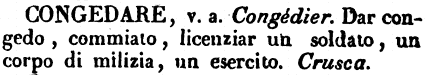 | Congedare - v. a. Congédier. Dar congedo, commiato, licenziar un soldato, un corpo di milizia, un esercito. Crusca. [immagine] |