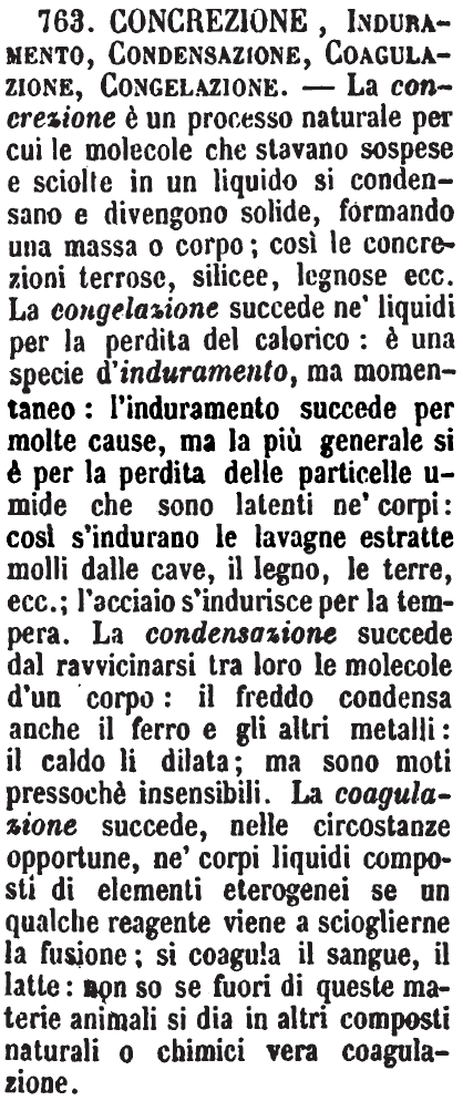 | Concrezione, Induramento, Condensazione, Coagulazione, Congelazione - La concrezione è un processo naturale per cui le molecole che stavano sospese e sciolte in un liquido si condensano e divengono solide, formando una massa o corpo; così le concrezioni terrose, silicee, legnose ecc. La congelazione succede ne' liquidi per la perdita del calorico: è una specie d'induramento, ma momentaneo: l'induramento succede per molte cause, ma la più generale si è per la perdita delle particelle umide che sono latenti ne' corpi: così s'indurano le lavagne estratte molli dalle cave, il legno, le terre, ecc.; l'acciaio s'indurisce per la tempera. La condensazione succede dal ravvicinarsi tra loro le molecole d'un corpo: il freddo condensa anche il ferro e gli altri metalli: il caldo li dilata; ma sono moti pressochè insensibili. La coagulazione succede, nelle circostanze opportune, ne' corpi luquidi composti di elementi eterogenei se un qualche reagente viene a scioglierne la fusione; si coagula il sangue, il latte: non so se fuori di queste materie animali si dia in altri composti naturali o chimici vera coagulazione. [immagine] |