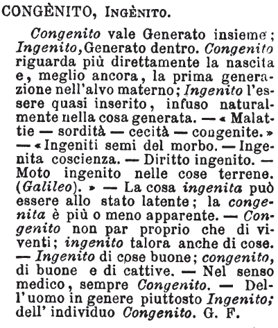 | Congenito, Ingenito - Congenito vale Generato insieme; Ingenito, Generato dentro. Congenito riguarda più direttamente la nascita e, meglio ancora, la prima generazione nell'alvo materno; Ingenito l'essere quasi inserito, infuso naturalmente nella cosa generata. - «Malattie - sordità - cecità - congenite.» - «Ingeniti semi del morbo. - Ingenita coscienza. - Diritto ingenito. - Moto ingenito nelle cose terrene. (Galileo).» - La cosa ingenita può essere allo stato latente; la congenita è più o meno apparente. - Congenito non par proprio che di viventi; ingenito talora anche di cose. - Ingenito di cose buone; congenito, di buone e di cattive. - Nel senso medico, sempre Congenito. - Dell'uomo in genere piuttosto Ingenito; dell'individuo Congenito. G. F. [immagine] |