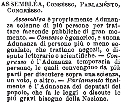 | Assemblea, Consesso, Parlamento, Congresso - Assemblea è propriamente Adunanza solenne di più persone per trattare faccende pubbliche di gran momento. - Consesso è generico, e suona Adunanza di persone più o meno segnalate, che trattano negozii, o dispute letterarie o scientifiche. - Congresso è l'Adunanza temporaria di persone, le quali convengono da più parti per discutere sopra una scienza, un voto, o altro. - Parlamento finalmente è l'Adunanza dei deputati del popolo, che fa le leggi e discute le più gravi bisogne della Nazione. [immagine] |