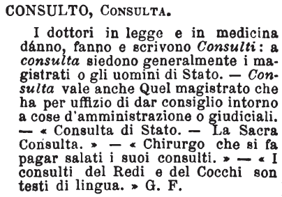 | Consulto, Consulta - I dottori in legge e in medicina dánno, fanno e scrivono Consulti: a consulta siedono generalmente i magistrati o gli uomini di Stato. - Consulta vale anche Quel magistrato che ha per uffizio di dar consiglio intorno a cose d'amministrazione o giudiciali. - «Consulta di Stato. - La Sacra Consulta.» - «Chirurgo che si fa pagar salati i suoi consulti.» - «I consulti del Redi e del Cocchi son testi di lingua.» G. F. [immagine] |
