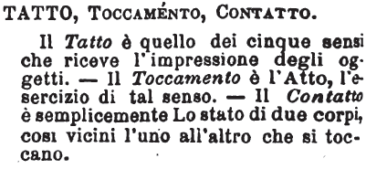 | Tatto, Toccamento, Contatto - Il Tatto è quello dei cinque sensi che riceve l'impressione degli oggetti. - Il Toccamento è l'Atto, l'esercizio di tal senso. - Il Contatto è semplicemente Lo stato di due corpi, così vicini l'uno all'altro che si toccano. [immagine] |