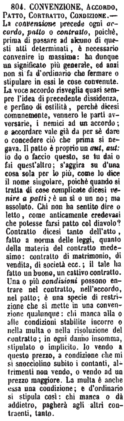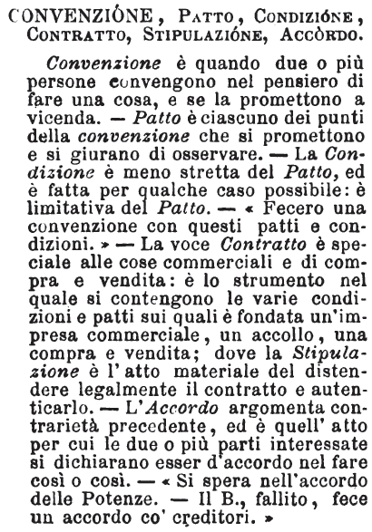 | Convenzione, Patto, Condizione, Contratto, Stipulazione, Accordo - Convenzione è quando due o più persone convengono nel pensiero di fare una cosa, e se la promettono a vicenda. - Patto è ciascuno dei punti della convenzione che si promettono e si giurano di osservare. - La Condizione è meno stretta del Patto, ed è fatta per qualche caso possibile: è limitativa del Patto. - «Fecero una convenzione con questi patti e condizioni.» - La voce Contratto è speciale alle cose commerciali e di compra e vendita: è lo strumento nel quale si contengono le varie condizioni e patti sui quali è fondata un'impresa commerciale, un accollo, una compra e vendita; dove la Stipulazione è l'atto materiale del distendere legalmente il contratto e autenticarlo. - L'Accordo argomenta contrarietà precedente, ed è quell'atto per cui le due o più parti interessate si dichiarano esser d'accordo nel fare così o così. - «Si spera nell'accordo delle Potenze. - Il B., fallito, fece un accordo co' creditori.» [immagine] |