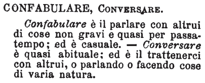 | Confabulare, Conversare - Confabulare è il parlare con altrui di cose non gravi e quasi per passatempo; ed è casuale. - Conversare è quasi abituale; ed è il trattenerci con altrui, o parlando o facendo cose di varia natura. [immagine] |
