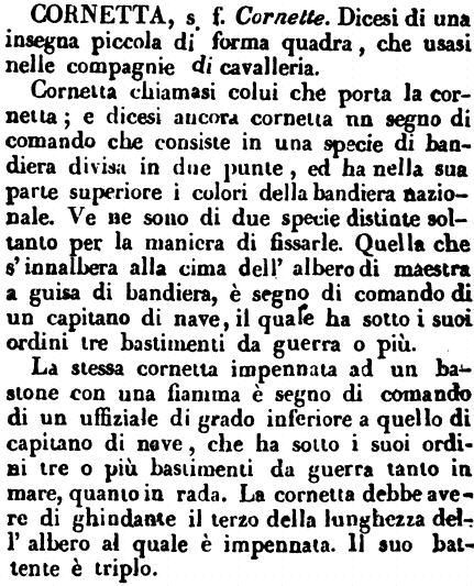 Cornetta chiamasi colui che porta la cornetta; e dicesi ancora cornetta un segno di comando che consiste in una specie di bandiera divisa in due punte, ed ha nella sua parte superiore i colori della bandiera nazionale. Ve ne sono di due specie distinte soltanto per la maniera di fissarle. Quella che s'innalbera alla cima dell'albero di maestra a guisa di bandiera, è segno di comando di un capitano di nave, il quale ha sotto i suoi ordini tre bastimenti da guerra o più. La stressa cornetta impennata ad un bastone con una fiamma è segno di comando di un uffiziale di grado inferiore a quello di capitano di nave, che ha sotto i suoi ordini tre o più bastimenti da guerra tanto in mare, quanto in rada. La cornetta debbe avere di ghindante il terzo della lunghezza dell'albero al quale è impennata. Il suo battente è triplo. [immagine] |