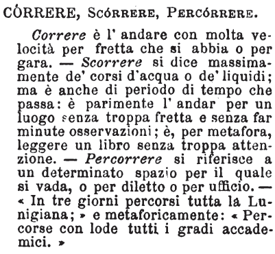 | Correre, Accorrere, Ho corso, Son corso - S'accorre al bisogno, alla chiamata. Si corre per la fretta, per sollazzo, per torsi il freddo e che so io. S'accorre anche andando piano: un povero vecchio vede cadere un fanciullo, e accorre, per quanto può, a rialzarlo. Ho corso, vale ho fatto una lunga gita correndo; son corso, vale son venuto o andato al più presto: abbiam corso per la campagna; siamo corsi pel medico. [immagine] |