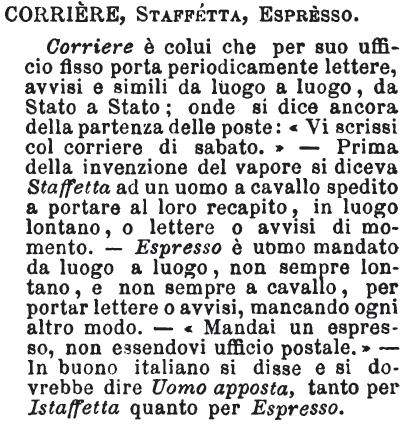 | Corriere, Staffetta, Espresso - Corriere è colui che per suo ufficio fisso porta periodicamente lettere, avvisi e simili da luogo a luogo, da Stato e Stato; onde si dice ancora della partenza delle poste: «Vi scrissi col corriere di sabato.» - Prima della invenzione del vapore si diceva Staffetta ad un uomo cavallo spedito a portare al loro recapito, in luogo lontano, o lettere o avvisi di momento. - Espresso è uomo mandato a luogo a luogo, non sempre lontano, e non sempre a cavallo, per portar lettere o avvisi, mancando ogni altro modo. - «Mandai un espresso, non essendovi ufficio postale.» - In buono italiano si disse e si dovrebbe dire Uomo apposta, tanto per Istaffetta quanto per Espresso. [immagine] |