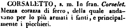 | Corsaletto - s. m. In franc. Corselet. Mezza corazza di ferro, della quale andavano per lo più armati i fanti, e principalmente i picchieri. [immagine] |
