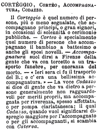 | Corteggio, Corteo, Accompagnatura, Codazzo - Il Corteggio è quel numero di persone, più o meno segnalate, che accompagnano principi, o gran signori, in occasioni di solennità o cerimonie pubbliche. - Corteo è specialmente quel numero di persone che accompagnano il bambino a battesimo e anche gli sposi novelli. - Accompagnatura suol dirsi a Firenze della gente che va con torcetto a un trasporto funebre, per onoranza del morto. - «Ieri sera ci fu il trasporto del B.; e c'era una bellissima accompagnatura.» - La voce Codazzo si dice di gente che va dietro a persone generalmente non ragguardevoli per meriti proprii, ma accompagnata per riverenza, spesso affettata, o per pompa ciarlatanesca; il qual Codazzo, quando vuol significarsi dispregio maggiore per l'accompagnato o per gli accompagnanti, si scambia con Caterva. [immagine] |