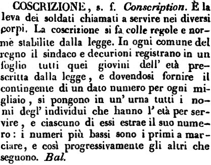 Coscrizione - s. f. Conscription. È la leva dei soldati chiamati a servire nei diversi corpi. La coscrizione si fa colle regole e norme stabilite dalla legge. In ogni comune del regno il sindaco e decurioni registrano in un foglio tutti quei giovini dell'età prescritta dalla legge, e dovendosi fornire il contingente di un dato numero per ogni migliaio, si pongono in un'urna tutti i nomi degl'individui che hanno l'età per servire, e ciascuno di essi estrae il suo numero: i numeri più bassi sono i primi a marciare, e così progressivamente gli altri che seguono. Bal. [immagine]
