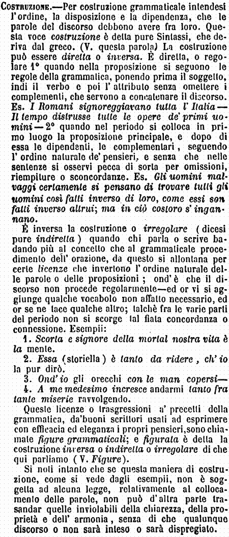 | Costruzione - Per costruzione grammaticale intendesi l'ordine, la disposizione e la dipendenza, che le parole del discorso debbono avere fra loro. Questa voce costruzione è detta pure Sintassi, che deriva dal greco. (V. questa parola) La costruzione può essere diretta o inversa. E' diretta, o regolare 1° quando nella proposizione si seguono le regole della grammatica, ponendo prima il soggetto, indi il verbo e poi l'attributo senza omettere i complementi, che servono a concatenare il discorso. Es. I Romani signoreggiavano tutta l'Italia - Il tempo distrusse tutte le opere de' primi uomini - 2° quando nel periodo si colloca in primo luogo la proposizione principale, e dopo di essa le dipendenti, le complementari, seguendo l'ordine naturale de' pensieri, e senza che nelle sentenze si osservi pecca di sorta per omissioni, riempiture o sconcordanze. Es. Gli uomini malvaggi certamente si pensano di trovare tutti gli uomini così fatti inverso di loro, come essi son fatti inverso altrui; ma in ciò costoro s'ingannano.