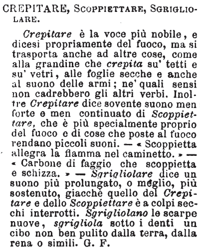 | Crepitare, Scoppiettare, Sgrigliolare - Crepitare è la voce più nobile, e dicesi propriamente del fuoco, ma si trasporta anche ad altre cose, come alla gradine che crepita su' tetti e su' vetri, alle foglie secche e anche al suono delle armi; ne' quali sensi non cadrebbero gli altri verbi. Inoltre Crepitare dice sovente suono men forte e men continuato di Scoppiettare, che è più specialmente proprio del fuoco e di cose che poste al fuoco rendano piccoli suoni. - «Scoppietta allegra la fiamma nel caminetto.» - «Carbone di faggio che scoppietta e schizza.» - Sgrigliolare dice un suono più prolungato, o meglio, più sostenuto, giacchè quello del Crepitare e dello Scoppiettare è a colpi secchi interrotti. Sgrigliolano le scarpe nuove, sgrigliola sotto i denti un cibo non ben pulito dalla terra, dalla rena o simili. G. F. [immagine] |